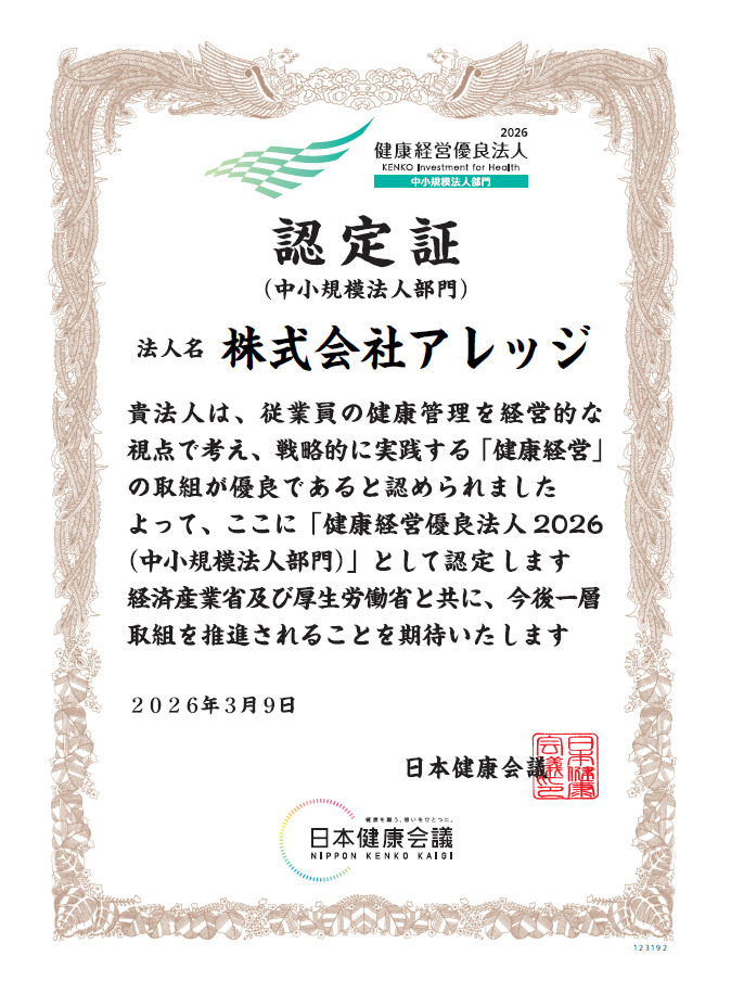 株式会社アレッジは、2026年も経済産業省と日本健康会議が主催する健康経営優良法人認定制度にて、